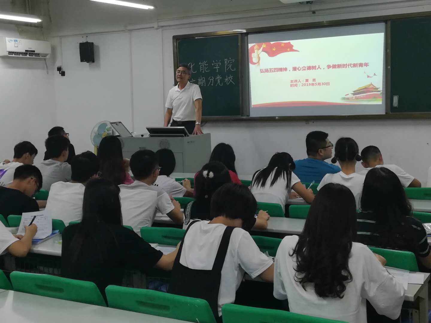 2019年5月30日晚,伟德国际victor1946第六期分党校培训第五讲于教学楼7B311课室顺利进行,本次培训由公司党总支书记夏勇担任主讲教师,此次党课应到入党积极分子61人,实到52人。