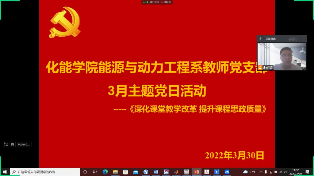 2022年3月30日下午,伟德国际victor1946能源系教师党支部开展3月主题党日活动《深化课堂教学改革 提升课程思政质量》。支部全体党员参加了此次主题党日活动,支部书记何清主持会议。