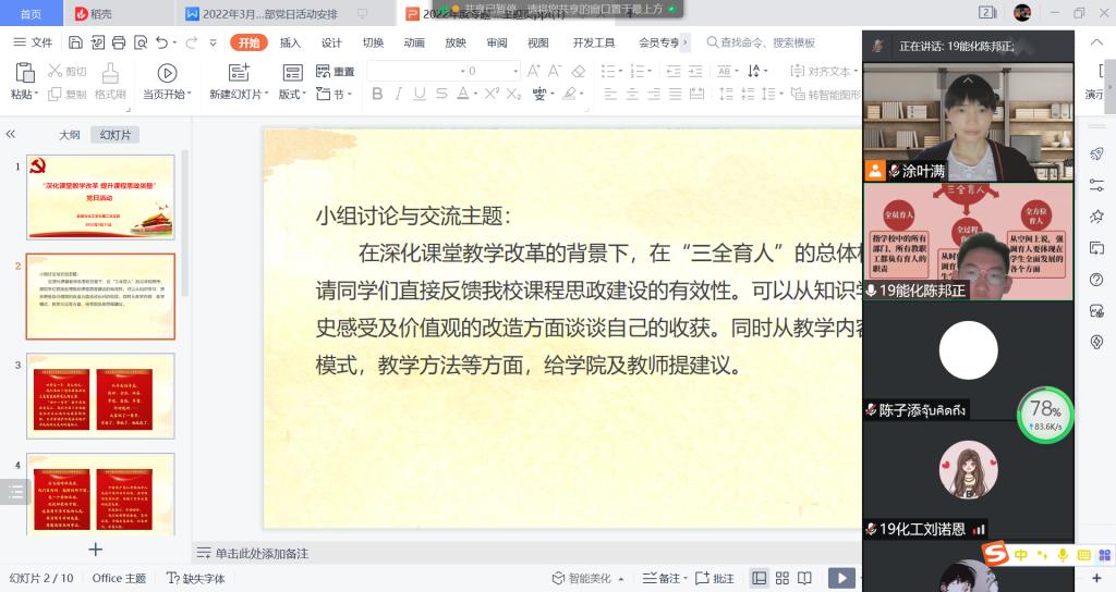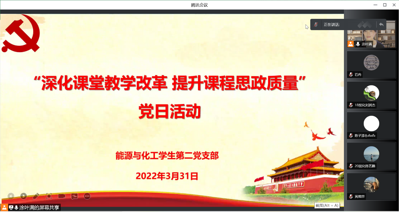 2022年3月31日下午,能源与化工员工第二党支部于腾讯会议开展了“深化课堂教学改革,提升课程思政质量”主题党日活动,会议由支部书记涂叶满主持。