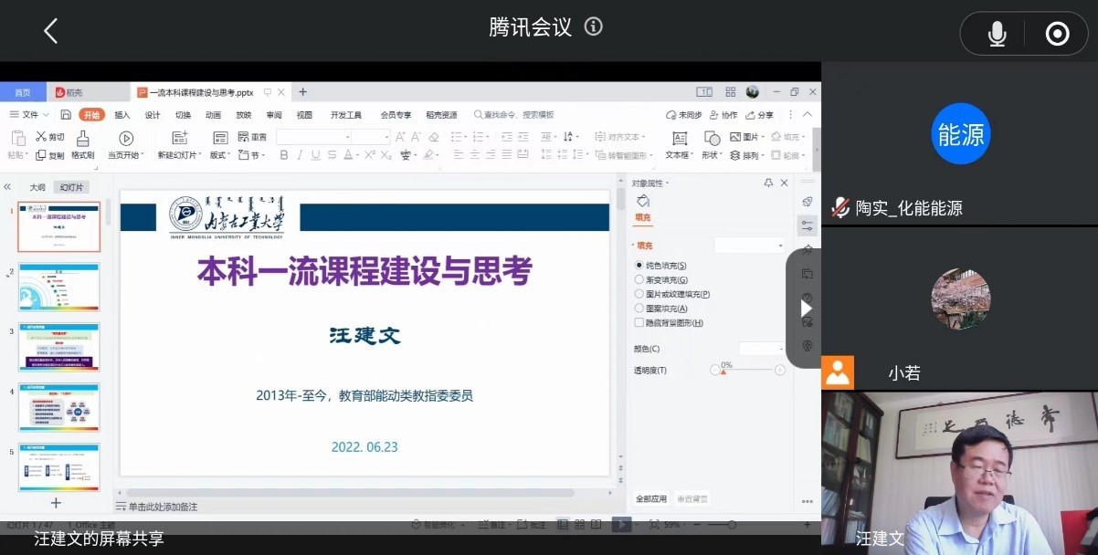 2022年6月23日,为加快推进能源系一流本科课程建设,提升教书育人的水平,教育部能动类教指委委员、公司特聘教授汪建文老师应邀为能源系就一流本科课程建设作线上交流指导。会议由能源系系主任郭晓娟主持,能源系全体教师参会。