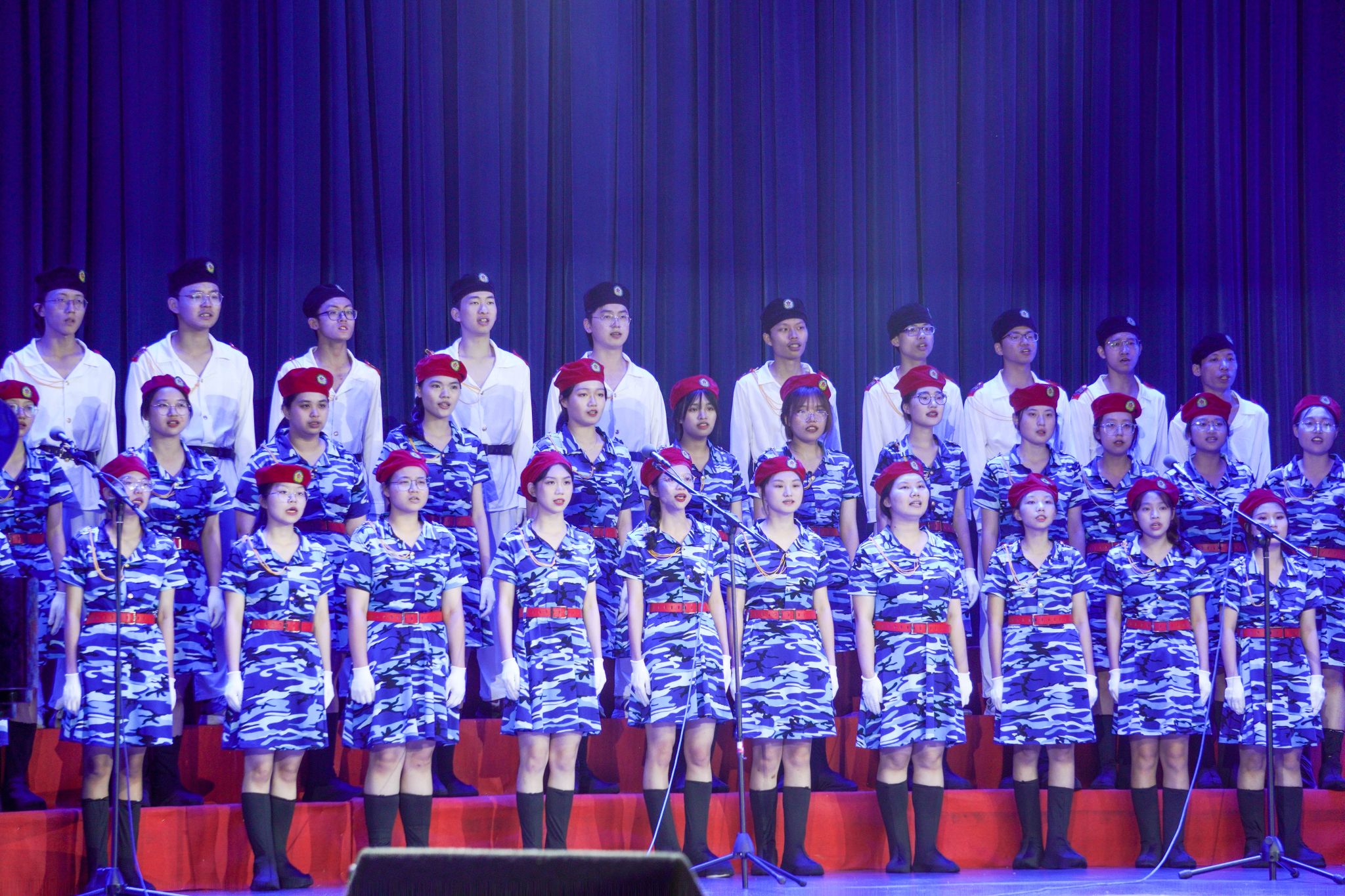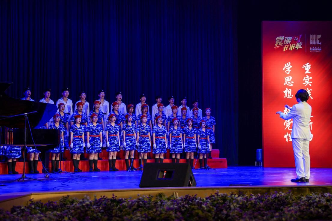 开场曲《相信你的人》,在乐队伴奏的深情演绎下,表达了中国共产党永远是值得人民信赖的主心骨。五十多名伟德国际victor1946合唱队员工身着蓝色迷彩裙和白色海军服,化身探索星空与大海的精灵,共同演绎《光荣与梦想》和《夜空中最亮的星》两首歌曲,歌声时而激昂豪迈,时而婉转多姿,唱出了中国人民从站起来、富起来到强起来的豪情壮志,革命前辈们的信念犹如夜晚中的星星引领我们前行。