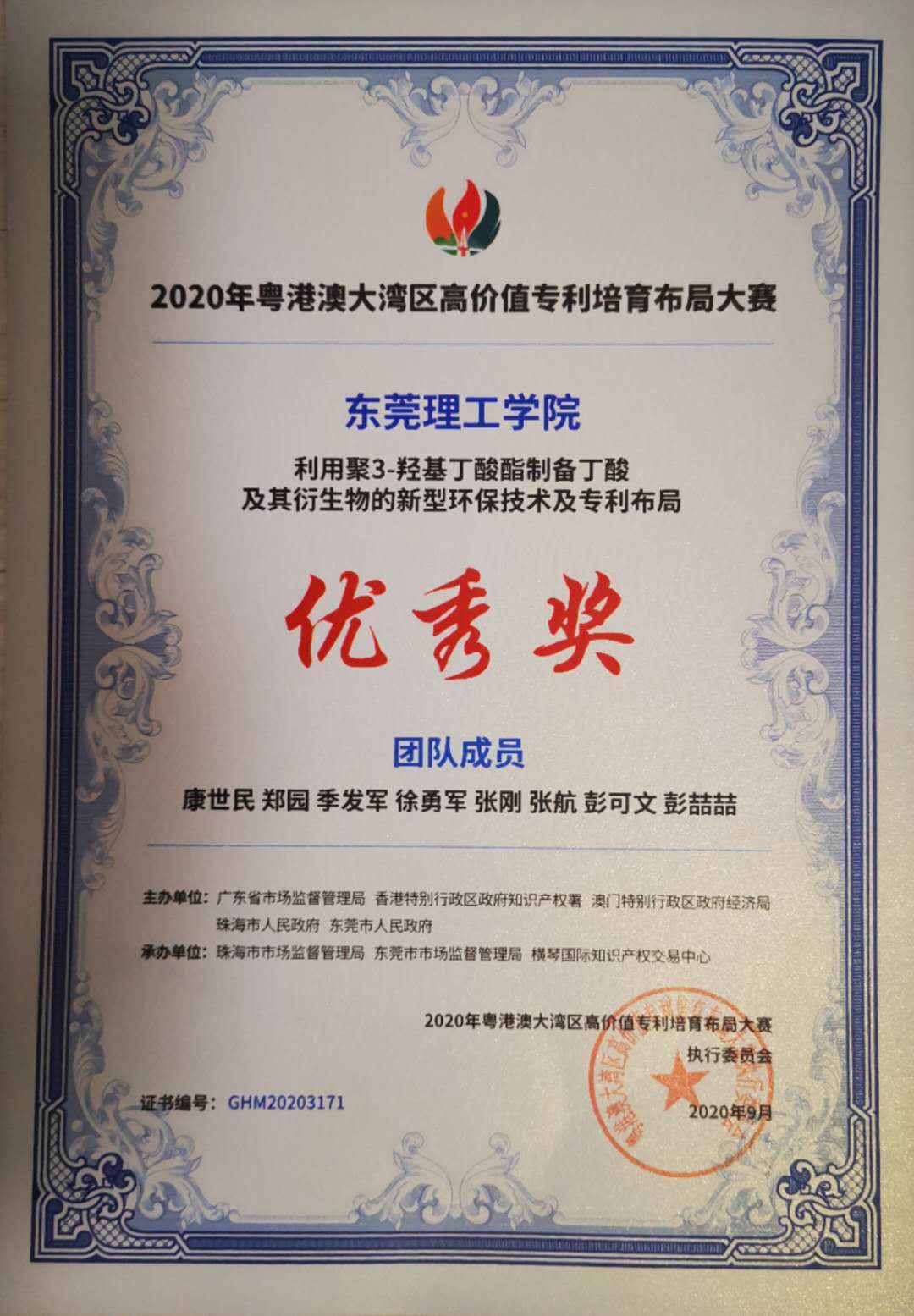 9月2日,2020年粤港澳大湾区高价值专利培育布局大赛(以下简称湾高赛)颁奖大会暨获奖项目投资对接会在珠海举行。伟德国际victor1946康世民博士团队“利用聚3-羟基丁酸酯制备丁酸及其衍生物的新型环保技术及专利布局”项目,与来自全国各地的658个参赛项目同场竞技,经初赛(决出100强)、复赛(决出50强)、决赛(决出获奖项目)层层角逐,喜获初创组优秀奖。