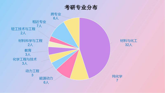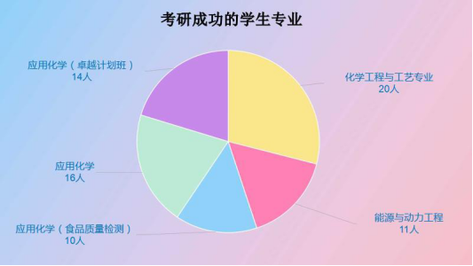 化能学子今年被录取研究生专业分布比较广泛。包括材料科学与工程、应用化学、物理化学、化学工程与技术、天然药物化学、食品工程、食品科学、化学工艺、动力工程及工程热物理、有机化学、生物化学与分子生物学、精细化工等多个专业和方向。其中考取的专业主要集中在材料与化工,共有32人。其次是能源动力,化学工程与技术,动力工程,材料科学与工程,动力工程,化学,生物制药,还有6名员工跨学科跨专业考取会计学,金融,心理学等专业。