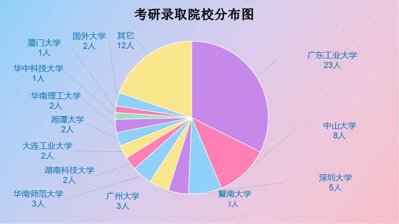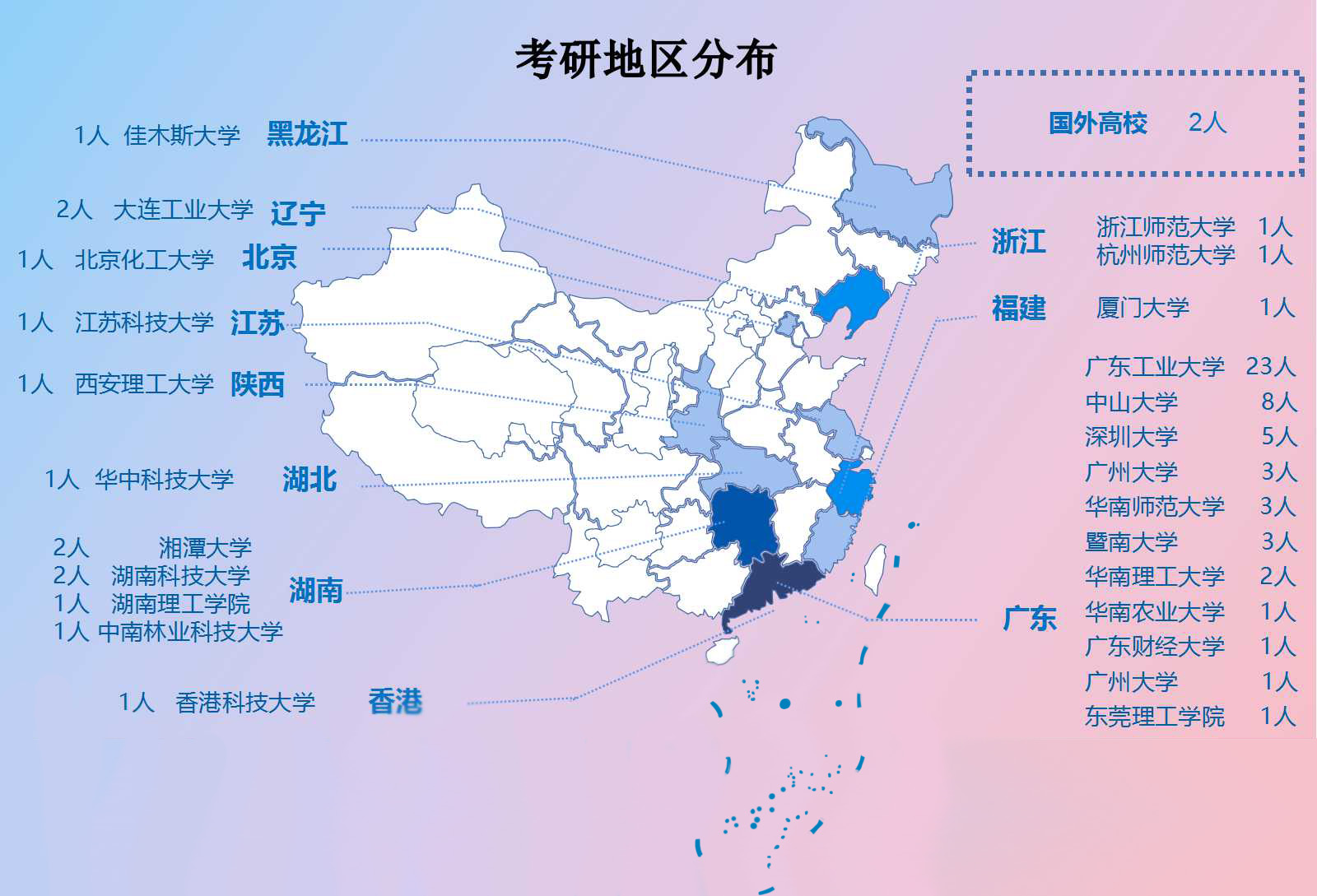 在录取公司名单中,往年化能学子报考公司地区范围主要集中在广东省内,今年员工选择更加多样化,有19人选择考入香港科技大学、厦门大学、华中科技大学、大连工业大学、湘潭大学、湖南科技大学、佳木斯大学等不同省份和地区的高校。其中2人出国深造考取的国外大学分别是杜伦大学(Durham University)和卡迪夫大学(Cardiff university);