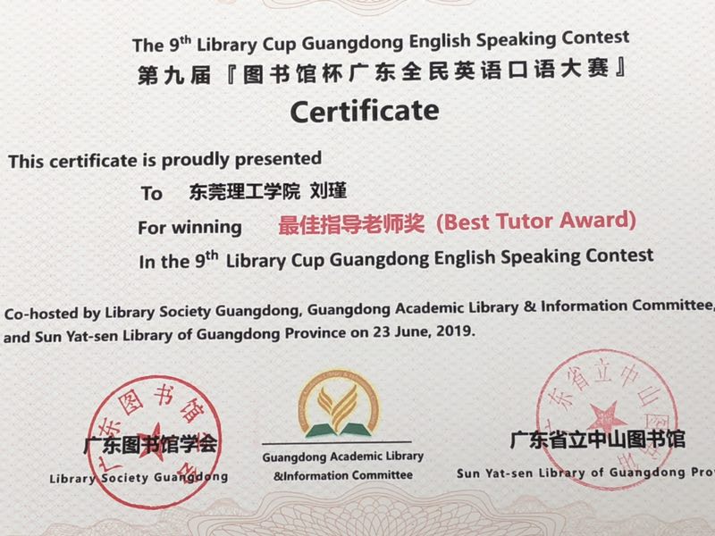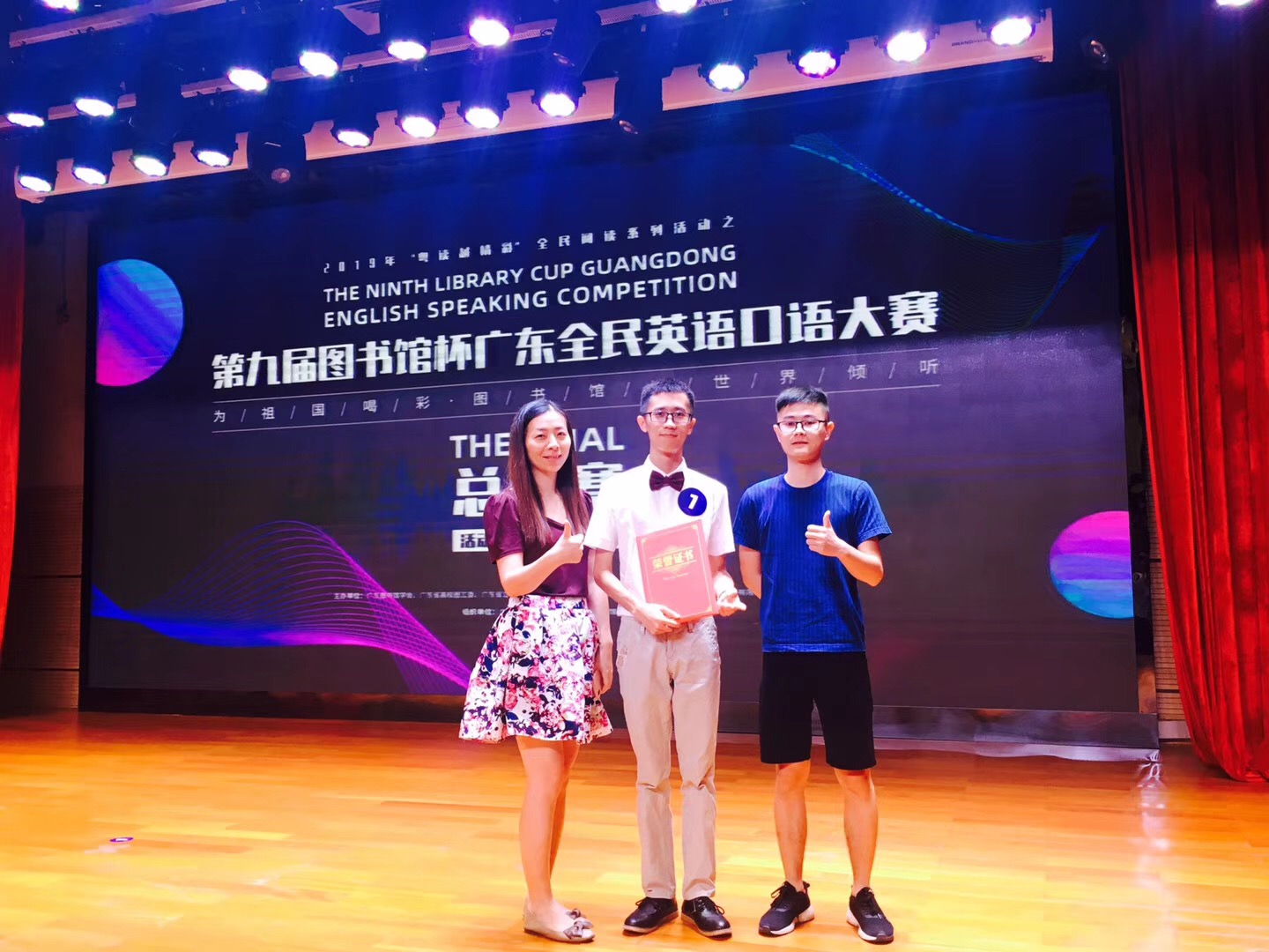 2019年6月23日,第九届“图书馆杯广东全民英语口语大赛” 暨全国首届“图书馆杯全民英语口语风采展示活动”广东赛区在广东省立中山图书馆一号报告厅落幕。本次比赛全省共计173所图书馆参与,总报名人数30993人。历时两个多月,全省仅有17名人脱颖而出,其中包括伟德国际victor194617级应用化学2班员工陈子豪,他过关斩将成功晋级总决赛,并获得省级二等奖。指导老师刘瑾老师也获最佳指导老师奖。