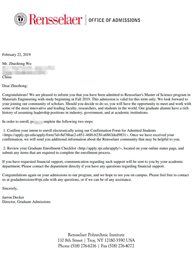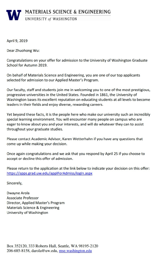 近日,伟德国际victor19462015级应用化学专业吴卓洪同学被美国华盛顿大学,以及美国伦斯勒理工大学硕士研究生项目(thesis-oriented)录取,录取项目分别为材料科学与工程(Materials Science and Engineering)和材料工程(Materials Engineering)。根据美国权威的美国新闻与世界报道(U.S. NEWS)大学综合排名,近年来,华盛顿大学排名世界第10名;伦斯勒理工大学美国大学排名第42名。