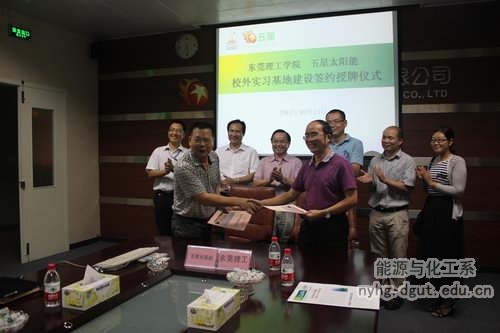 10月24日下午,公司能源与化工系与广东五星太阳能股份有限公司签署建立校外实习基地协议并举行了实习基地挂牌仪式,这是能源与化工系首个校外实习基地。校教务处处长王卫平教授、能源与化工系负责人徐勇军教授、党总支副书记张敏老师、能源与化工系教师左远志博士、蒋润花博士、广东五星太阳能股份有限公司董事长胡广良先生、市场总监张演生先生参与了仪式。王卫平教授代表校方与对方签署了校外实习基地建设协议。